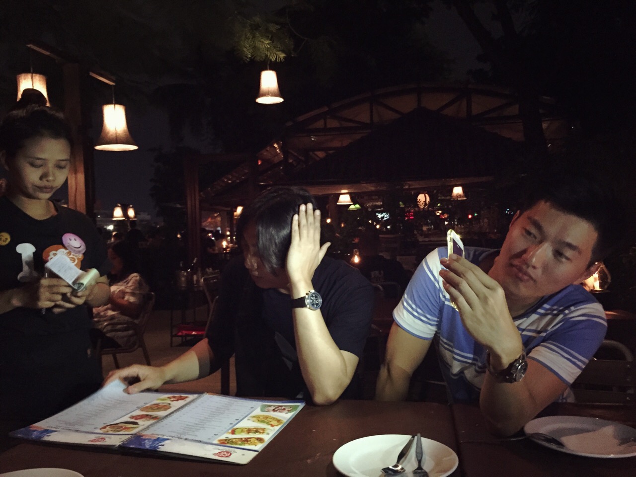 | 奧斯丁非常認真的在記錄阿德使用泰文點菜。 |