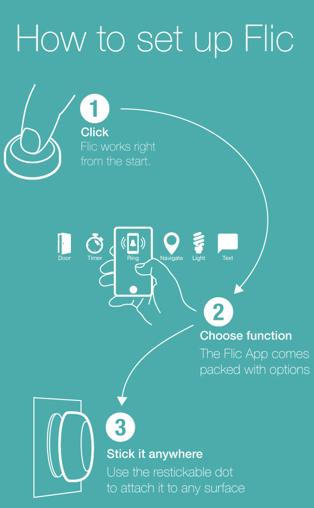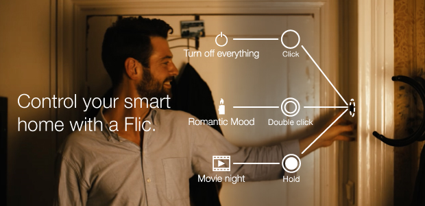 Flic 是一個矽膠材質的無線按鈕,以電池發電,不過在按下按鈕時才會發電。它使用低耗能的藍牙與行動裝置連接,連接完成指定需要的功能,最多可以指定三種功能,日後也可隨時更改。Flic 有效連接距離達45公尺,便可在這距離按鈕啟動功能,底部附有雙面膠,能重覆黏貼任何表面。按鈕僅一顆,當然三種功能不會是相同按法,分別是按一下、連續按兩下、長按。但如果家中有記性不好的老人,還是別設太多功能。