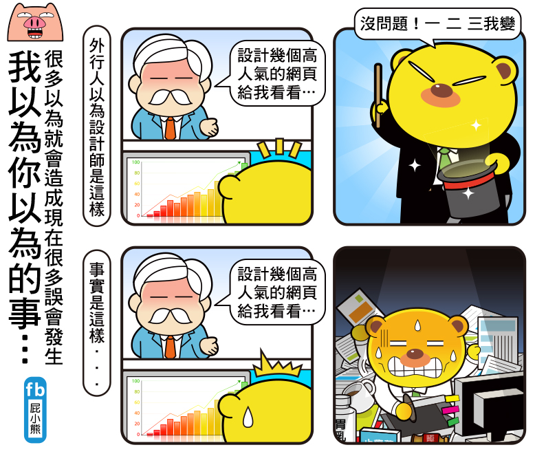 屁小熊 2014/12/19瀏覽: views 隔行如隔山,所以很多不是本行業的人總是以自己的認知來要求別人… 以上漫畫說的真的就是大部分設計師一定會遇到的問題,我想很多職場的辛酸也一定有如此的遭遇發生過,大家都以為你應該是怎樣怎樣~都忽略背後的辛苦…所以將心比心啊… 我以為你很耐操的說… 你是從哪聽來這種話的… 由屁小熊的小冊日記貼文。 由屁小熊的小冊日記貼文。 Related Items 圖文觀點 2014/12/19瀏覽: views 屁小熊 愛分享上班搞笑的屁熊還有內褲豬,職場不開心的話就快來找我們 ■作者:屁小熊 ■主題:職場、漫畫、生活、搞笑 ■個人網站:https://padbear68ee07.blogspot.com/ ■FB粉絲團:https://www.facebook.com/ppbear123 ■連絡方式:197968ee07@gmail.com Related Items next page