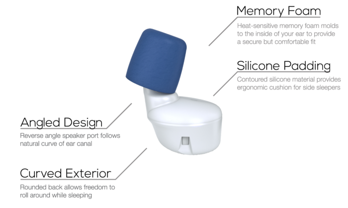 Hush的設計圍繞”舒適”為要素,測試了市售多種泡沫耳塞,並以3D列印出數百種樣式,尋求耳塞的理想設計,並找來多位測試者實際佩帶入睡,進行使用意見調查。最終定義以下四個設計元素。藍色的耳塞是使用熱感應式記憶棉,長時間使用後會根據用戶的耳朵定型;白色的是矽膠,依循人體工學設計。整體的角度從耳朵內部延伸到外,完全貼合內耳溝、外耳的形狀,在長時間佩帶後不感疼痛不適。
