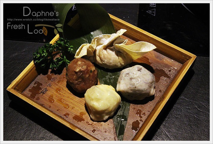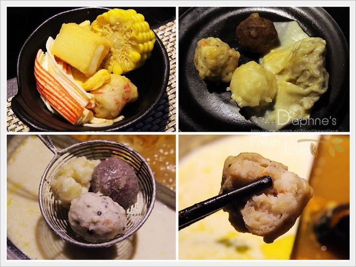 綜合手打丸4種口味各一:黑松露蝦丸、起司牛肉丸、芋香花枝丸、黃金豬肉雲吞。