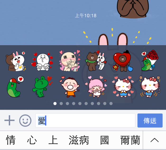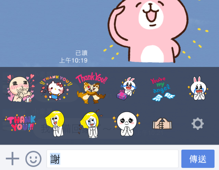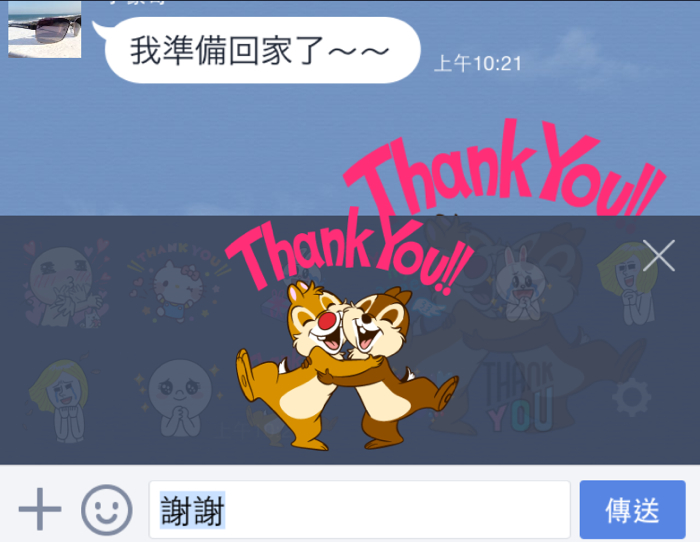 目前只要是 LINE 4.6.0 以上的行動裝置版本,當我們在對話視窗中打入”謝謝”、”等等”、”晚安”… 等詞句,就會在上方跳出我們所擁有的相關貼圖,不論是動態還是表情符號,通通都會列在其中讓我們挑選。