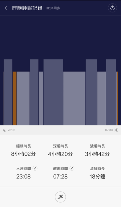 當我們帶著手環入睡時,不需要做任何設定就會自動感應切換到睡眠偵測模式,等到隔天起床便能透過手機來看到自己前一晚的睡眠狀況如何。