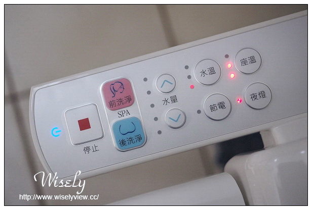 側邊的操作鍵有各項中文顯示功能,像是女性專用的前洗淨、男女通用的後洗淨、控制水溫與座溫的三段調節,以及水量強度設定;若是使用相關調整設定時,按下節電則會在無人時使用時進入節電休眠,並且還有夜燈的設計。