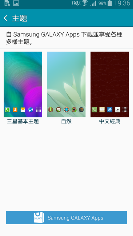 GALAXY A5除了在拍照部分有往年輕族群設計外,在桌布主題上也有年輕化,可自由更換主題,讓桌面與圖示更為活潑。