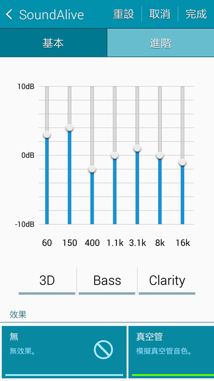 進階選項中你也可以自行調整各區段頻率的音量,底下還有增強環繞感、低音感與清晰度的選項可調整。