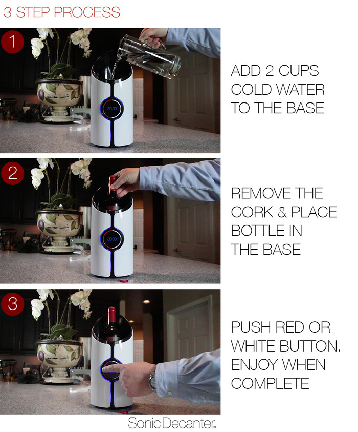 這台醒酒器是以3D列印機製造,再做進一步的測試,以確保設計的有效性,讓葡萄酒產生香味,讓口味更柔和並有果香。倒入兩壺冷水在醒酒器內,放入酒瓶,按下電源。至於醒酒的原理為何?是運用超音波的能量,讓葡萄酒中的分子與化學結構改變,這種變化為永久性,可促進酒香,讓口感順暢,餘味悠長。當使用超音波的能量,酒變得更均勻的液體,還可改善的開瓶後的“保質期”,並分解葡萄酒中的添加物、二氧化硫等。