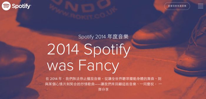 一年一度國際線上音樂盛事又來了! 國際線上音樂串流平台 Spotify 今天公佈 2014 年度音樂風雲榜,透過5,000 萬使用者的收聽習慣與超過 70 億小時的線上音樂串流數據,整理出今年最受歡迎的歌曲、歌手與專輯;除此之外,全球熱愛音樂的粉絲更可透過專屬活動網頁一窺 Spotify 的獨家音樂數據分析資料。