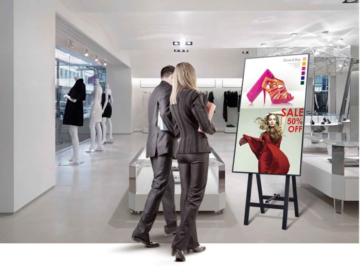 LG “立客來” 商用顯示看板,搭載獨家 IPS 面板技術,流暢呈現動態影像,呈現高注目力的廣告效果。使用 SuperSign 軟體的智慧化電子看板,能依據銷售計劃時段,輕鬆設定播放時間及內容,大幅提升廣告機動性,並精準投放訊息給予不同消費族群,提供高效率的商場應用選擇。此外,崁入式媒體播放器及簡易拆裝設計,給予更不受限的多元擺設方式。