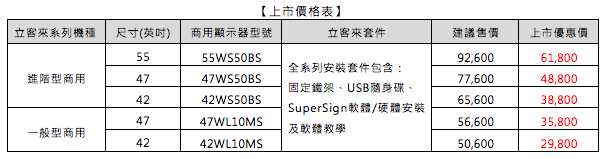為了因應多元影音數位趨勢,台灣 LG 電子推出動態影音商用電子看板”立客來”正式在台開賣。”立客來” 是由台灣 LG 電子特別打造,考量台灣中小企業需求,以 LG 引領業界的面板技術,推出高畫質及輕巧便利性的動態廣告看版,為店家有效吸引顧客注目及深度溝通商品資訊。可重複更換訊息的 “立客來”,不僅能有效節省中小企業廣告印製成本,更落實環保理念,改善一年四季促銷檔期廣告文宣無法重複使用的詬病。此外,LG 更是全國第一家獲 SGS ISO 9001 認證服務,並於全台設立 11 家服務中心,給予買家最安心且貼心的保障。