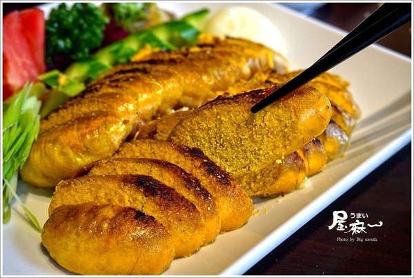 ▼金黃色的烤烏魚子吃起來外皮帶有點焦脆,裡頭有顆粒感,吃起來有濃郁的蛋香,吃起來沒有一般烏魚子的鹹味這麼重,反而更吃得到烏魚子的原味!