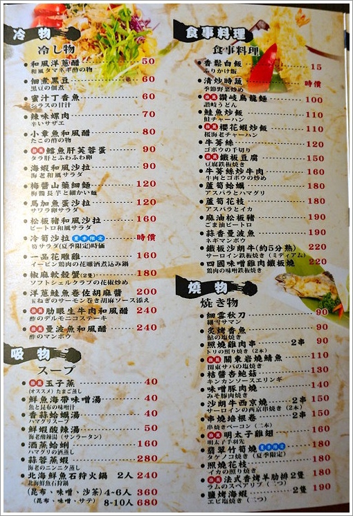 ▼餐點選擇多多,價位平實,有刺身、手卷、捲壽司、握壽司、冷物、吸物、食事料理、燒物、揚物、品酒、丼飯、商業定食等等,另外也有無菜單套餐及宴客菜單,幾乎可以滿足你所有的需求啊!以下菜單提供給大家參考!