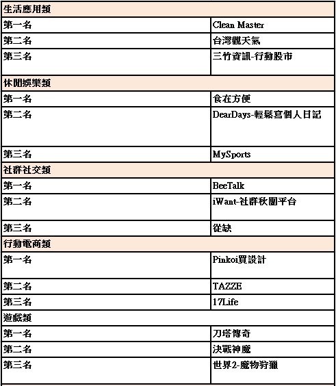 第四屆大賞共計頒發生活應用類、休閒娛樂類、社群社交類、行動電商類、遊戲類以及由網路人氣票選出的網路最佳人氣奬共 14 件年度大賞。得奬者分別是「生活應用類」第一名-Clean Master、第二名-台灣觀天氣、第二名-三竹資訊-行動股市,「休閒娛樂類」第一名-食在方便、第二名-DearDays-輕鬆寫個人日記、第三名-My Sports,「社群社交類」第一名-BeeTalk、第二名-iWant-社群揪團平台、第三名-從缺,「行動電商類」第一名-Pinkoi買設計、第二名-TAAZE、第三名-17 Life,「遊戲類」第一名-刀塔傳奇、第二名-決戰神魔、第三名-世界2魔物狩獵,而本屆榮獲網路投票第一的「網路最佳人氣獎」為免費MyCard。