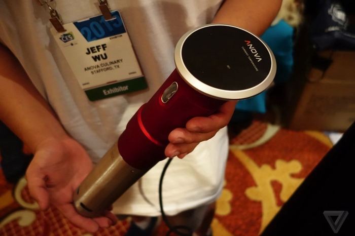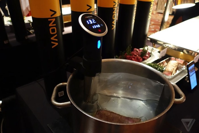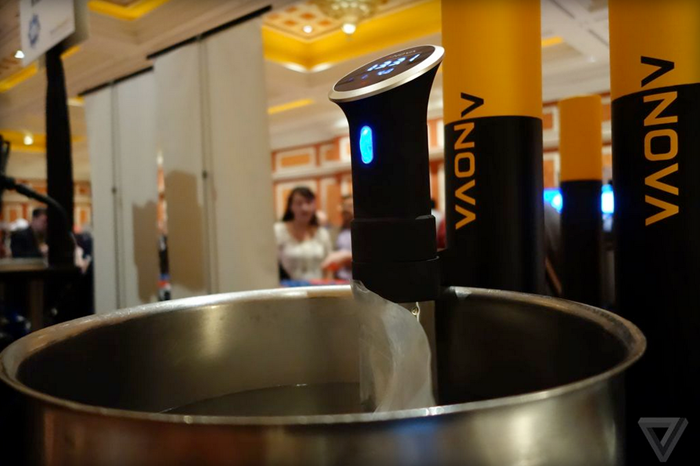 曾經報導過是新創公司Lower Easter Kitchen所推出的真空低溫烹調產品Nomiku ,真空低溫烹調法是利用較低溫度而長時間加熱的烹飪方法,通常約為 50°C 至 80°C 之間,可以減少肉類重量和水分的流失,蔬菜也適用,以達到料理口感與營養的最佳化。如果在外面的餐館要吃到現作的真空低溫烹調料理,等待費時且費用不低。除了Nomiku 有生產真空真空低溫烹調產品工具,另一家廠商Anova也有推出真空低溫烹調產品工具,並在 2015 CES展示以該公司的真空低溫烹調產品工具烹煮牛排。