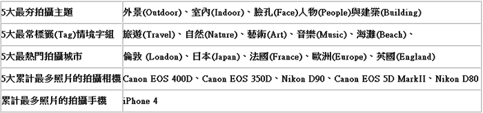 Flickr成立至今10年,已累積百億張影像。此次Flickr團隊與Yahoo Labs合作,首度針對平台內選出1億張Creative Commons (CC)授權照片進行數位攝影行為觀察分析;根據數據顯示「外景」為全球攝影者最愛拍攝的主題;而根據照片標籤(Tag) 顯示「旅遊」是最常拍照上傳的情境。(更多細節請參考Flickr與Yahoo Labs研究報告:http://yahoolabs.tumblr.com/post/89783581601/one-hundred-million-creative-commons-flickr-images