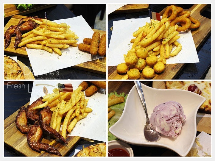 炸物:有薯條、乳酪條、水牛城的經點碟子及有薯條、洋蔥圈、雞米花的碟子雞米花。炸得不老不油,食材脆又嫩,水牛城雞翅吃起來鹹甜,跟別家吃到的不太一樣。