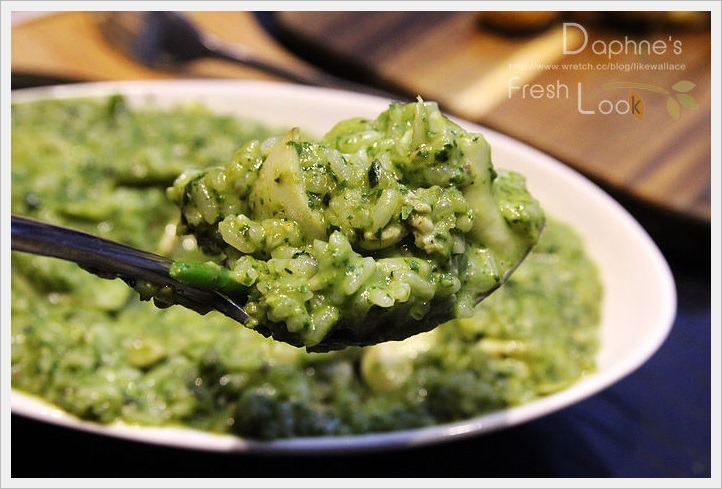 羅勒蕈菇嫩雞燉飯-青醬黏稠不油,青香有致。