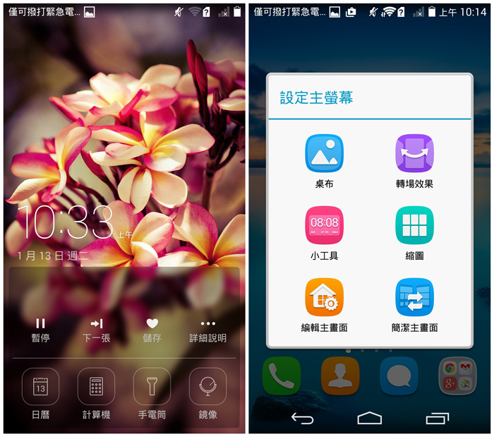 操作上有標準與簡潔兩種主畫面模式,而解鎖畫面也可以做設定,預設為自動變換的漂亮照片。另外主螢幕也能夠依需求增加不同的轉場效果或是切換方式。