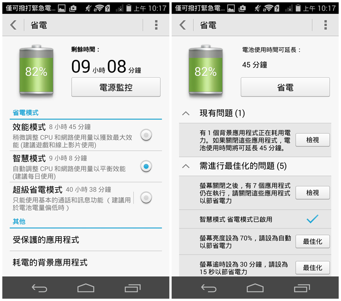 榮耀 6 在電池容量的部份採用高能量密度的 3,000mAh 鋰聚合物電池,當然系統的智慧省電也是滿重要的,據說可以有效省電 30%,我們平常可以一使用效率進行電源監控和省電模式的設定。