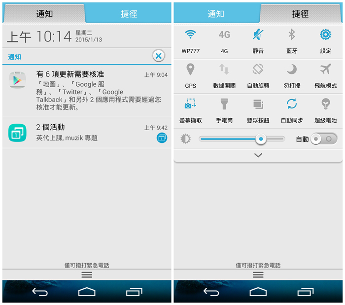 通知捷徑的設定畫面也相當簡潔有力,由螢幕頂端往下滑就可以看到這兩個主要標籤。