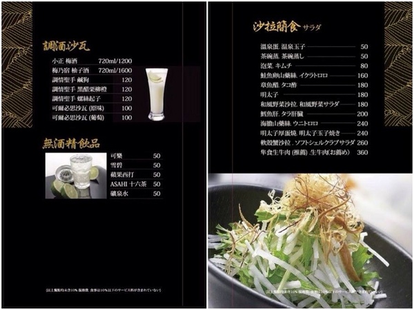 ▼另外也有調酒沙瓦、無酒精飲品、沙拉簡食、清酒、燒酎、洋酒、紅酒、啤酒等飲品,下班後來這裡小酌一番也是相當不賴!(未滿十八歲請勿飲酒)