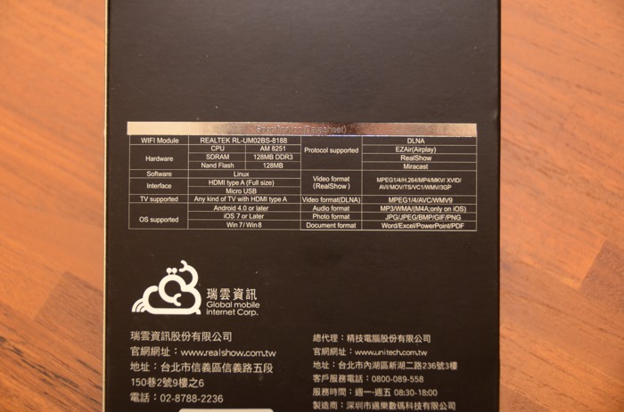 在規格部分,瑞雲資訊以瑞昱半導體的IC硬體優勢,使用號稱”解霸”的IC,解決手機相容性問題,具有優異的壓縮與解壓縮技術,讓影音無線傳輸更為流暢。