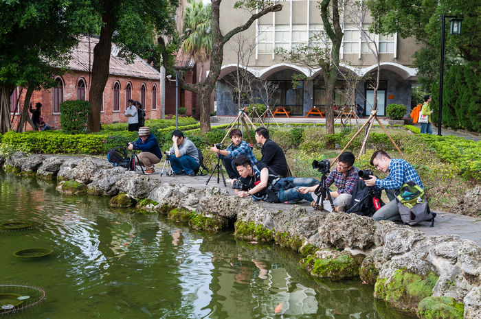 十幾台攝影相機及腳架在真理大學湖邊一字排開,攝影達人在旁親自指導攝影技巧