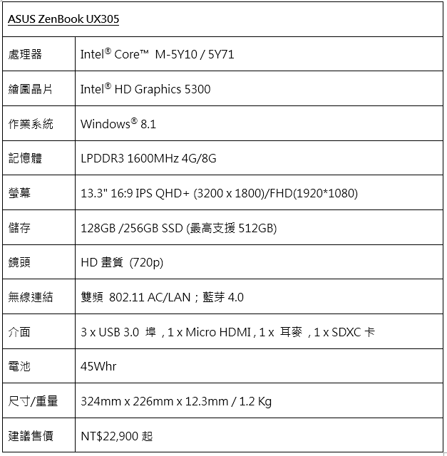 雖然這款並不是強調極強效能的筆電,不過還是簡單跑分讓大家參考,3DMARK11測試分數為P916、PCMARK VANTAGE測試分數13813,效能在同樣以商務使用的薄型化筆電中表現很不錯。ASUS ZenBook UX305目前共推出三種規格,分別是QHD+搭配5Y71處理器、8GB RAM、256GB SSD;QHD+搭配5Y10處理器、8GB RAM、256GB SSD;FHD搭配5Y10處理器、8GB RAM、256GB SSD,詳細規格請見下表。目前皆已上市,定價為台幣22,900元起起,如果需要更多資訊,可參考http://goo.gl/eDvI55。