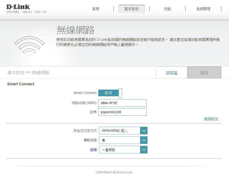 當然,在 D-Link 介面中你也能選擇要不要開啟 Smart Connect 功能,開啟狀態下你在無線網路只會看到一個 AC3200 DIR-890L 名稱,關閉才會出現 2.4GHz、5GHz 與 5GHz 三個頻段名稱。
