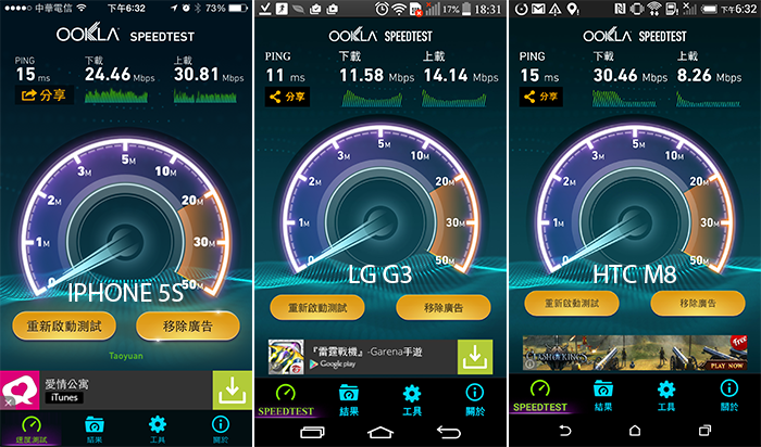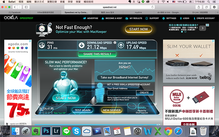介紹功能之前,我們先來實際測試看看 AC3200 DIR-890L 的網路速度表現如何。首先,環境是主流雙向光纖 100Mbps,為了符合真實的使用情境,我們使用五台裝置同時連線(iPhone 5S、LG G3、HTC M8、Macbook Pro 13 Retina、CJSCOPE),並利用 Speedtest 進行測試,得到的結果令人滿意!