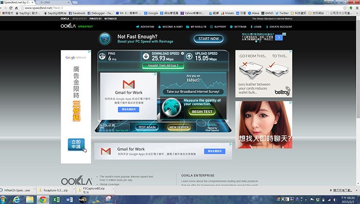 針對單一裝置,當然要測試出它的極限才行,所以這部分我們就直接來到 D-Link 總公司。測試環境是一個密閉空間,已避免其它 2.4GHz 或 5GHz 頻段裝置的干擾影響,對外頻寬300M/100M,同樣透過 SpeedTest 測試。