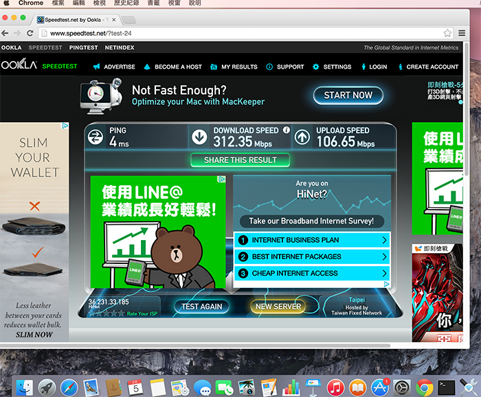 不僅下載高達 312.35 Mbps,上傳也高達 106.65 Mbps,這種速度相信網路重度使用者看到一定眼紅。