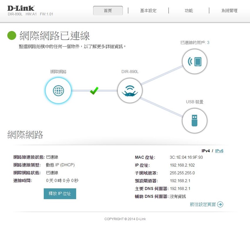 首頁方面可以隨時查詢網路連線狀況、連線的用戶數、以及 USB 裝置。
