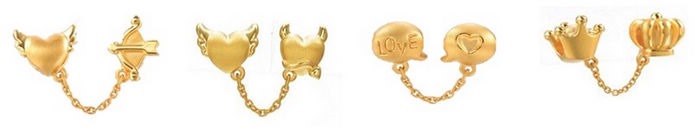 全新Double Charme黃金串飾新品,首度打造推出連繫2顆串飾的Double Charme系列,象徵兩人心時刻緊繫,也猶如情人的雙倍呵護甜蜜。另外,「愛情」和「童話」兩大足金串飾系列,也推出有著愛神丘比特的金箭,射向天下有情人,正中愛情標靶紅心,象徵傳遞愛與幸福的意涵;另外還有以天使與魔鬼為主題,配上愛心形的圖騰,巧妙描繪愛情裡的酸甜苦辣之感;以兩個互相親吻的串飾圖樣,分別刻畫上”Love”及”心型”的圖案,用最簡單的可愛,表達最直接的浪漫;最後,還有童話故事中的國王與皇后冠冕造型,象徵著男女生在愛情中都值得被幸福加冕,坐上彼此心中最重要的寶座。