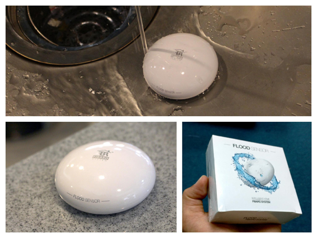 另外這個水滴感測器 Flood Sensor 也滿有意思的,除了感測水滴外,內建 LED 指示燈還有鬧鈴警示,感測到水時就會自動回報控制主機,另外有一個大特色就是永遠都會浮在水上,不會沉下去。