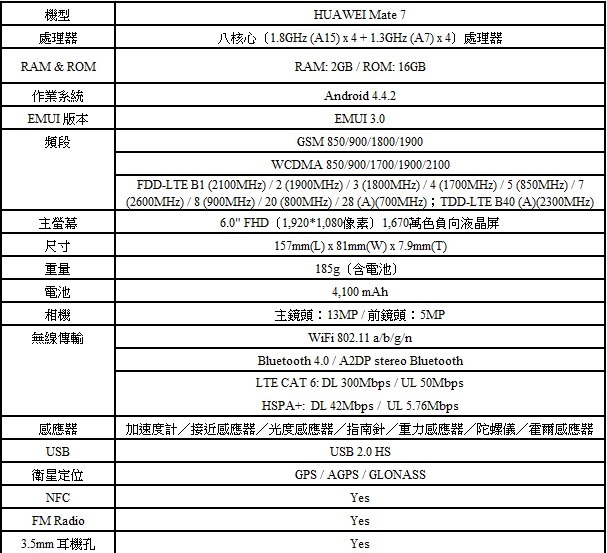 被GSM Arena、Android Authority、Android Central及Tom’s Guide評選為IFA 2014最佳旗艦手機的HUAWEI Mate7,自2014年9月上市後,全球銷售量已突破百萬台;目前在全球市場持續熱銷,在高階智慧手機地位站穩腳步,深受高階用戶喜愛。HUAWEI Mate7為全球首款按壓式指紋辨識Android手機,搭載八核心處理器,擁有4G LTE CAT 6極速飆網的完美高規格,同時以傲視業界螢幕邊框比,提供舒適視覺感受,在中國區上市前預購量高達105萬台。2014年10月底於台灣上市後,引起網友熱烈討論,供不應求;為了滿足消費者需求,自即日起,將於台灣之星上市、販售。HUAWEI Mate7建議售價15,900元,現在搭配台灣之星優惠資費方案,月繳 $1,399,立即以 0元超值價入手!凡於台灣之星全台門市購買首批上架HUAWEI Mate 7手機,再加贈限量原廠智慧翻蓋保護皮套,數量有限,送完為止。