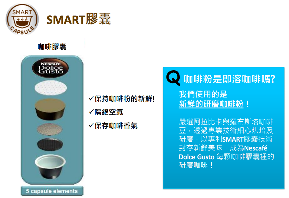 SMART咖啡膠囊裡封存的是專業烘焙的新鮮研磨咖啡粉,透過專利技術不僅可以隔絕空氣還能保留咖啡香氣,雖然雀巢的咖啡膠囊保存期限都會比一般膠囊短,卻也是他們對咖啡品質的堅持,確保每一杯咖啡在沖泡時都是新鮮美味咖啡。