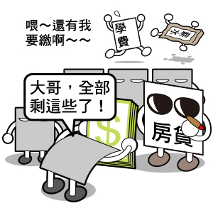 好幾萬元以上的費用,房貸應該是壓垮所有人薪水的最大原因吧~~幾乎薪水一半、甚至三分之二都有可能給了房貸…而且有了小朋友後,現在學費動不動一個學期就好幾萬啊~~~