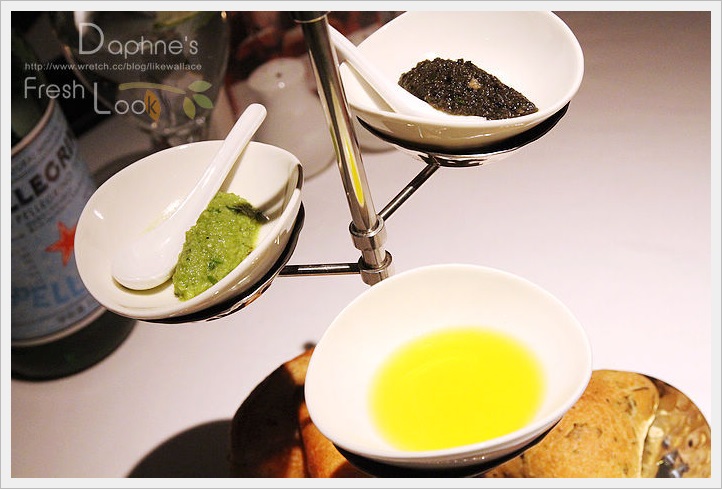 餐前麵包沾醬:綠色的是檸檬青豆泥醬,黑色的是黑橄欖醬,黃色的是初榨橄欖油,初榨橄欖油在橄欖油中是新鮮高品質,顏色黃亮,抹在麵包上滑潤帶果香。