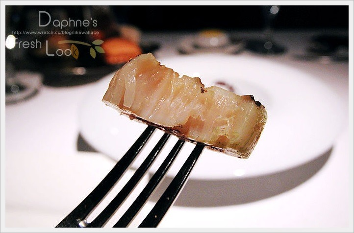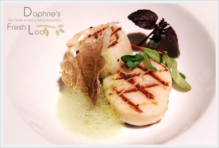 北海道甘貝加入帕瑪火腿乾及荷蘭芹打出的細綿泡泡,因而顏色呈現淡綠,乾煎時在甘貝上留下誘人的印記,也把焦氣襯出甘貝˙彈軟鮮美,細綿泡泡覆在甘貝搭襯之下,清爽的蔬香味轉成海味的過程變化很精彩。
