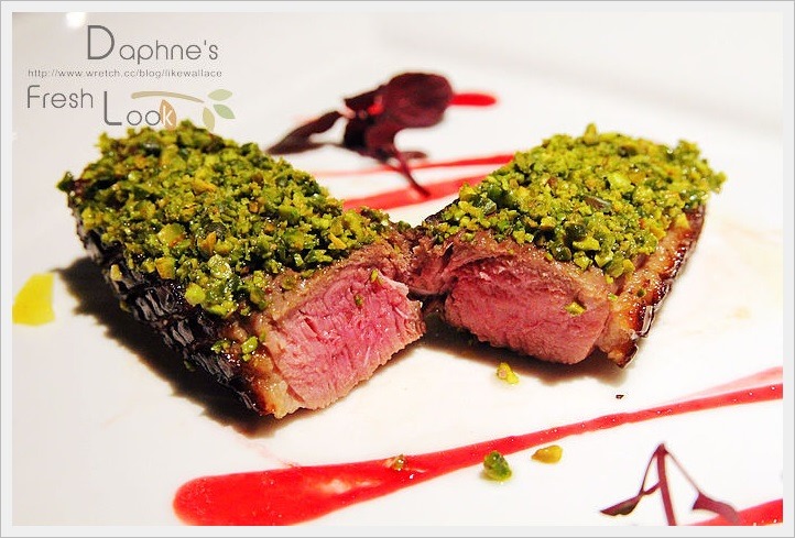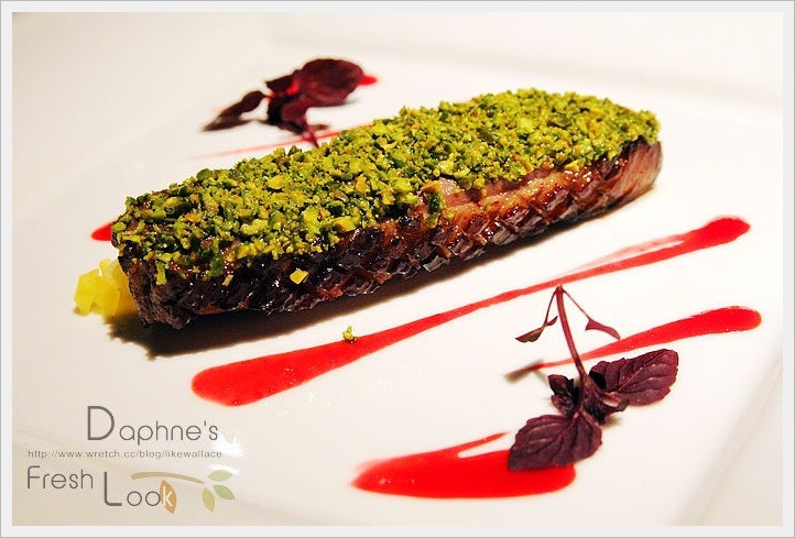 我不特別愛鴨肉料理,但這一道令我跟朋友都大呼好吃!鴨胸上綠色的是開心果,左邊黃色的是白酒洋梨,底下的是覆盆子醬。