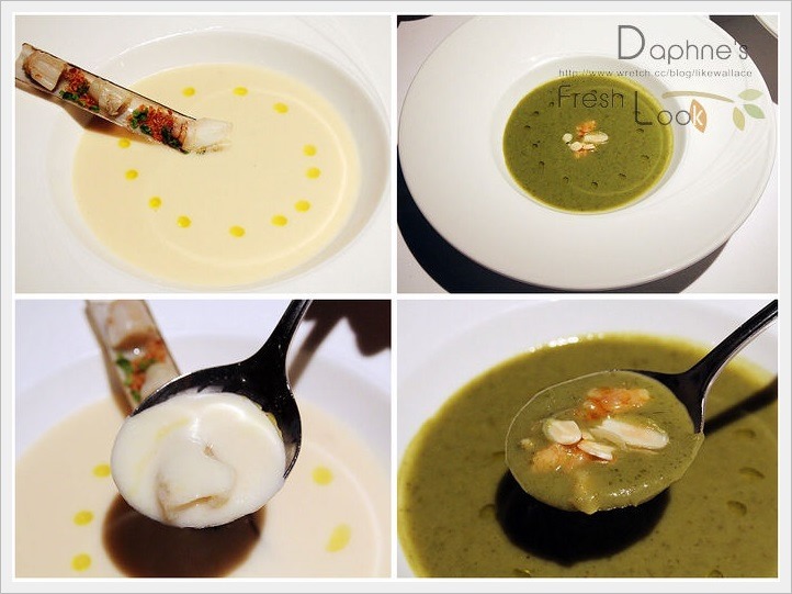 左上及左下:湯品-竹蟶蕪菁濃湯,右下及右上: 湯品-水田芥清蒜湯