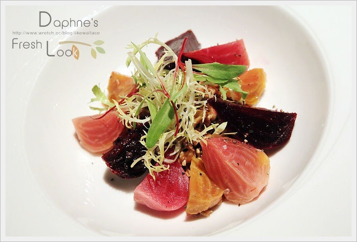 沙拉-烘烤迷你紅甜菜,有自製穀麥(底部)與綠捲鬚沙拉。正確來說這數種不一樣顏色的是甜菜根,軟度接近火龍果。甜菜的根部肥厚有汁,這些顏色都是甜菜的天然顏色,所以甜菜也可稱為天然色素。主味是甜的,但我認為還有非常淡的苦味,可能是來自菜根固有的青氣,與同樣有點苦的綠捲鬚生菜有搭到。
