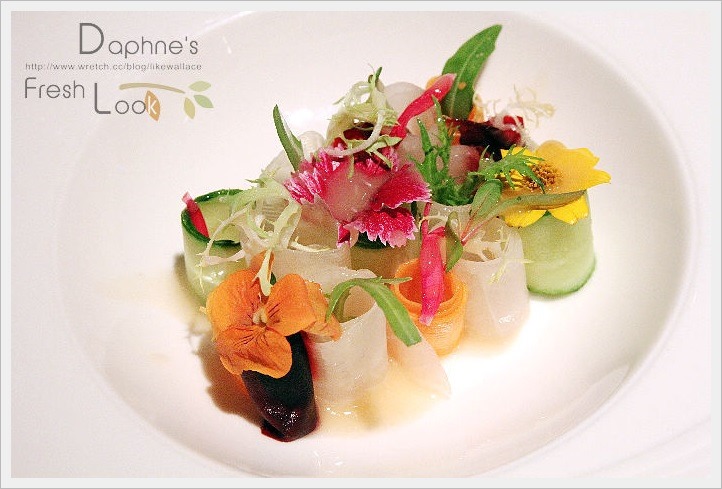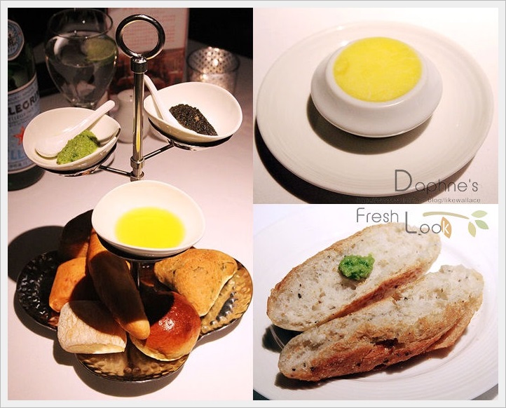 餐前麵包是飯店自製,可惜我在吃的時候有的吃不完要不就是切的很醜,所以只拍一點點照片代表。麵包的種類多達7種:有法國麵包、亞麻籽麵包、香菜麵包、蕃茄麵包、葡萄乾麵包、巧巴達、迷迭香麵包。常見以香草植物入料,每個都像是深層烘焙,內外紮實。我最喜歡蕃茄麵包,蕃茄果味容易辨識。附上的奶油在口中很容易化開,感覺很天然。