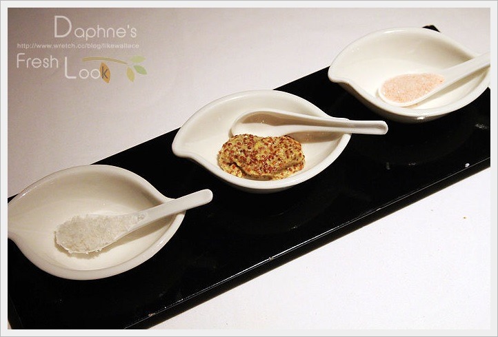 上面有提到白色的是法國鹽之花、芥末籽醬、喜馬拉雅山玫瑰鹽等沾料對於牛排的用途,我個人偏愛喜馬拉雅山玫瑰鹽,其次是法國鹽之花、芥末籽醬,因為覺得氣味甘香,並可引出牛肉的帶有粗獷感的原始美味,鹹度上也能接受。