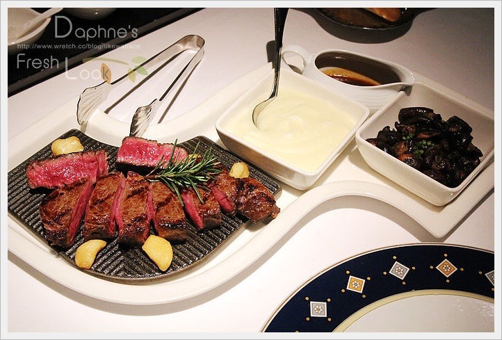 重頭戲上場!雖然跟朋友已經被餵食得有點半飽,但是看到牛排我們還是眼睛發亮,在端上牛排前服務生會送上供牛排的沾料:白色的是法國鹽之花,中間黃色的是芥末籽醬,粉色的是喜馬拉雅山玫瑰鹽,讓客人吃出不同的牛排風味。歐華賣的牛排頂級,各式配一定都不能太隨便,法國鹽之花是法國著名頂級海鹽,產量少而珍貴,芥末籽醬可以去除牛肉中的油膩油質並保留肉香,喜馬拉雅山玫瑰鹽可引出牛肉的原始甘甜美味。