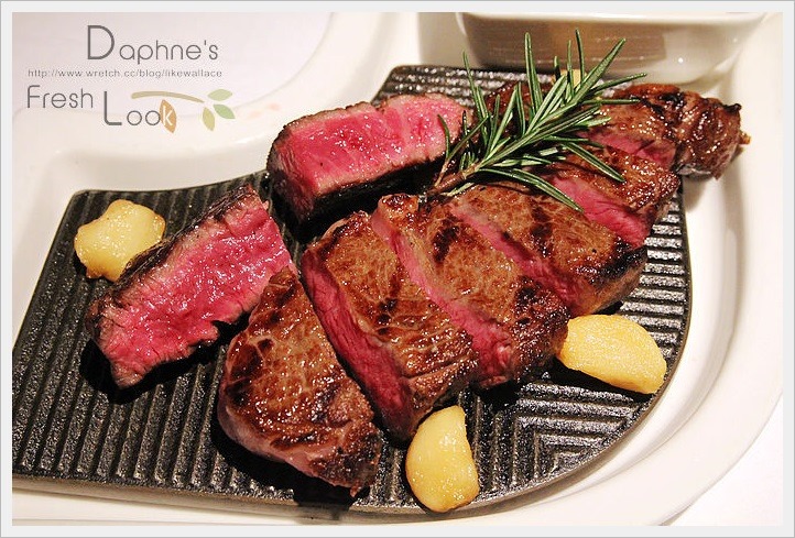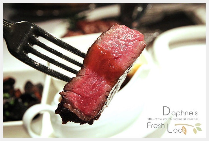 整個牛排餐以波浪S磁盤裝著,牛排底下有具保溫功能的鐵盤,同時服務生也會送上熱熱的大盤子讓客人方便食用牛排,牛排也都為我們切好,放在盤中只要再對切一兩次就可以入口。