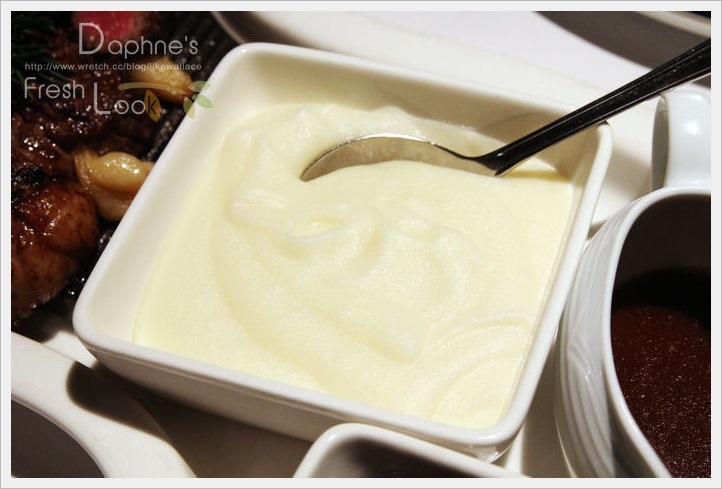 馬鈴薯泥不是以球狀出現,而是拌入奶油,成為更好入口的泥狀,柔滑綿細又稠密,吃完牛排再吃好有飽足感。