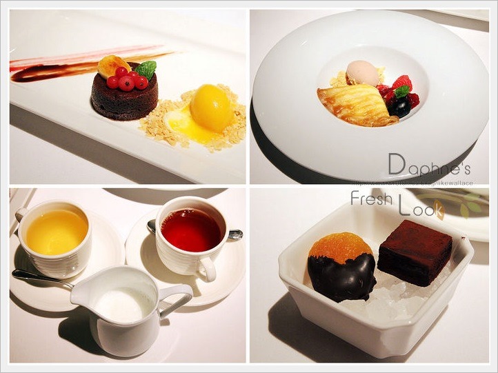左下:洋甘菊茶、紅茶。飲料共有茶類、咖啡選擇。並附上右下的小茶點,小茶點的種類並不固定,這天提供的是巧克力。