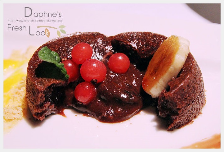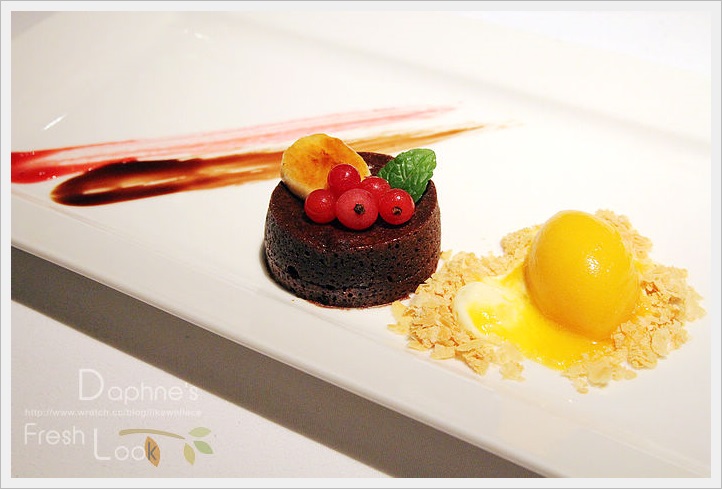 法芙納熱巧克力塔使用有”巧克力教父”之稱的品牌法芙娜 (Valrhona)巧克力製作,頂著幾顆酸甜的紅醋栗,搭冰凍香滑的芒果雪酪。